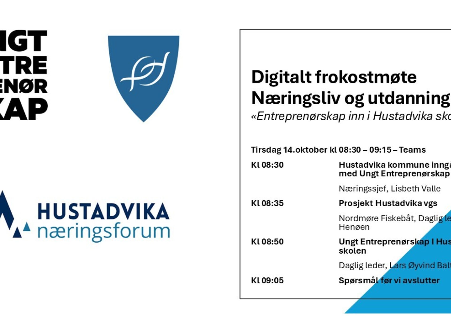 Tirsdag 14.oktober kl 08:30 – 09:15 inviterer vi næringslivet i Hustadvika til teams- møte for å gjøre enda mer entreprenørskap i Hustadvika skolen og for elevene våre.